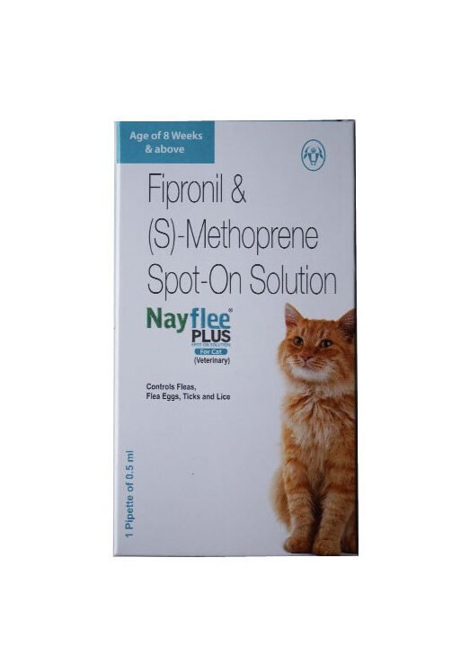 Intas Nayflee Plus is a highly effective flea and tick control solution specially designed for cats. It contains Fipronil and (S)-Methoprene, which work together to eliminate fleas, ticks, lice, and their eggs, preventing further infestation.